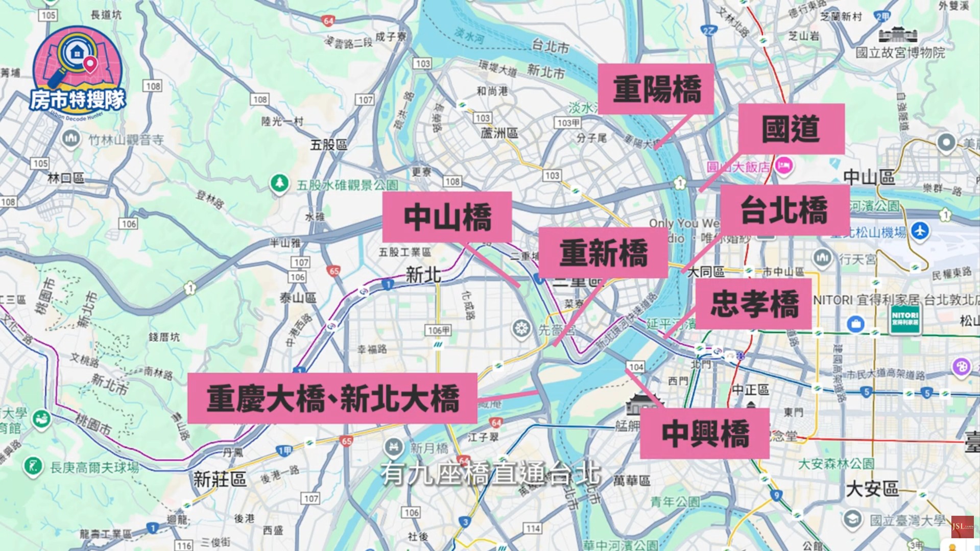 跨淡水河的橋樑多達 九座,形成猶如蜘蛛網般的生活圈: